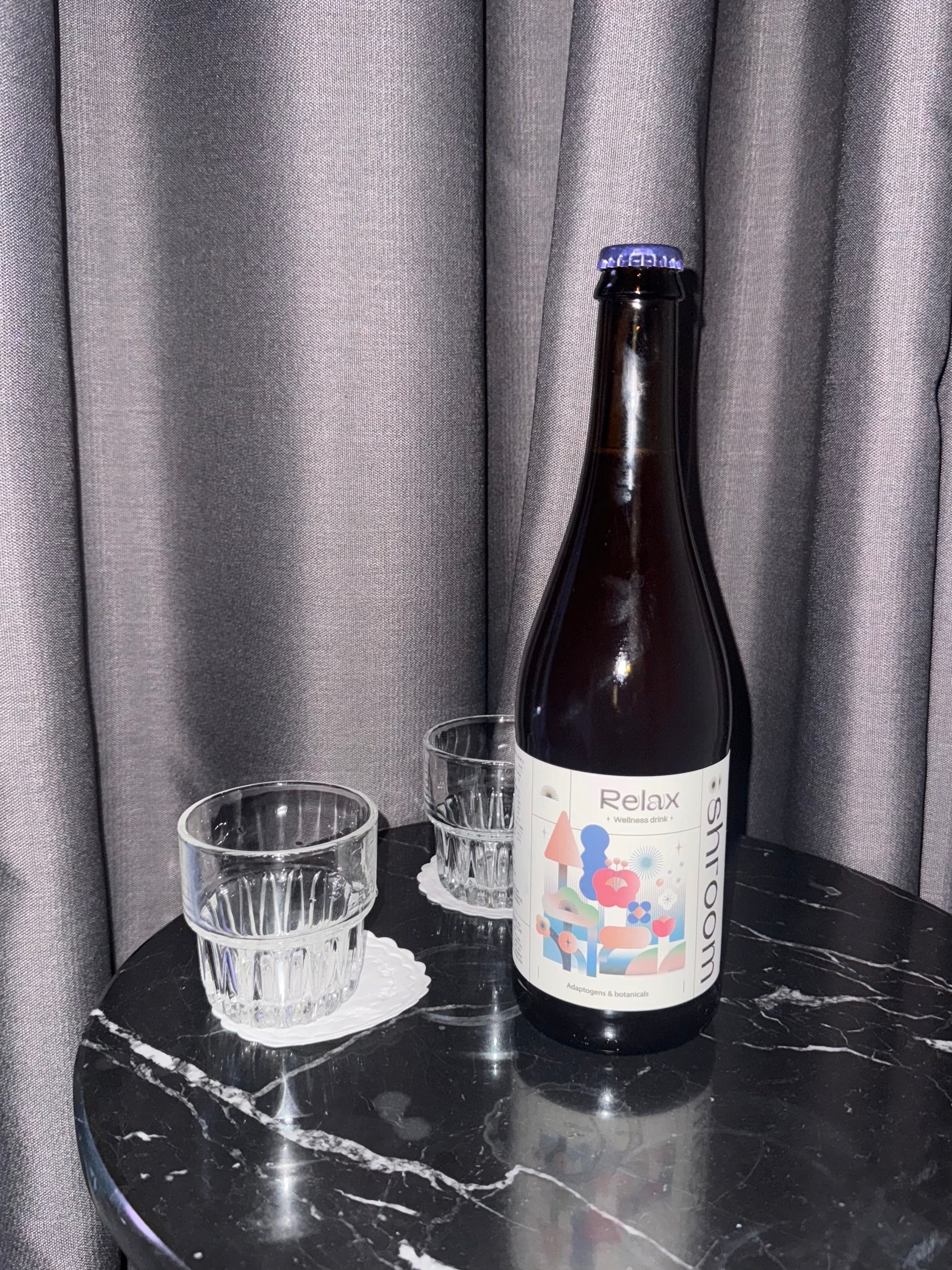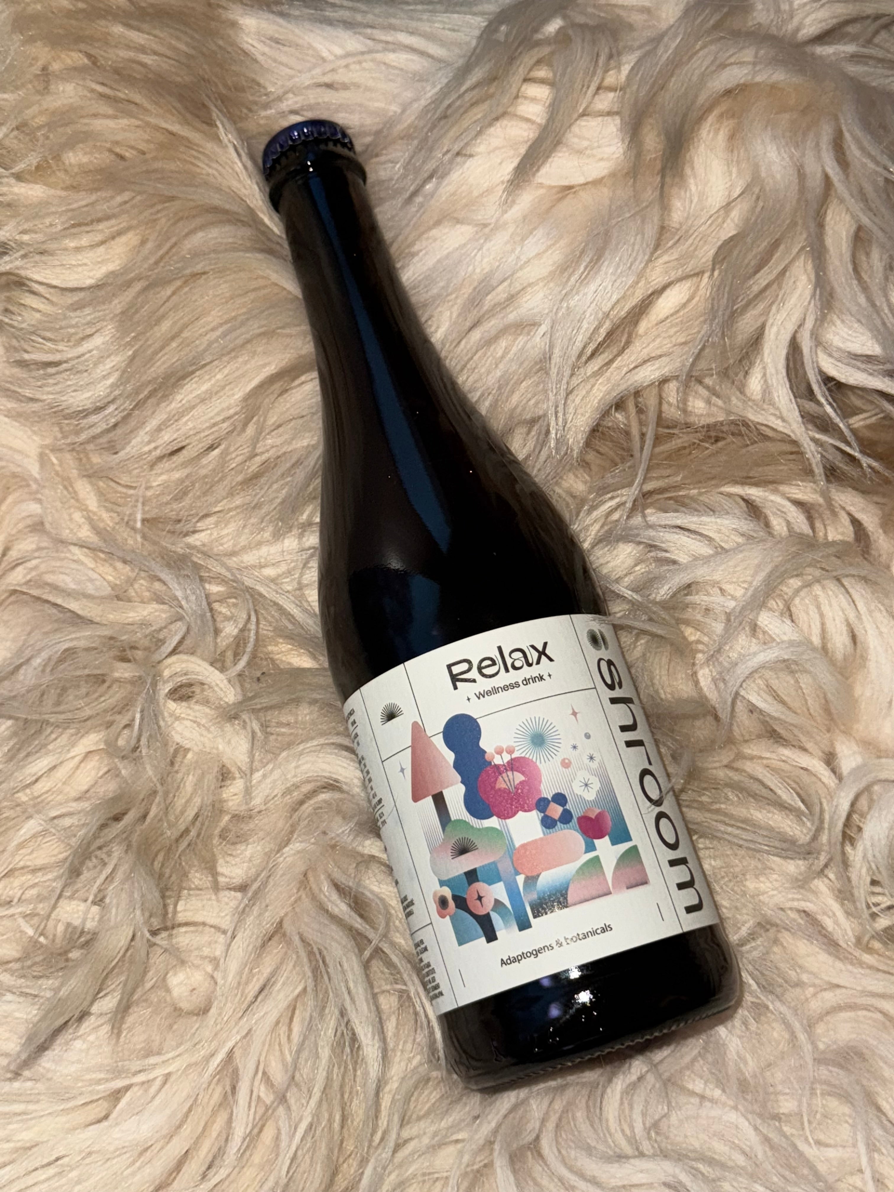 Shroom Relax – wellness drink to wind down. Lion's mane, hops, aronia base. No sugar added. Made for sharing at the table.